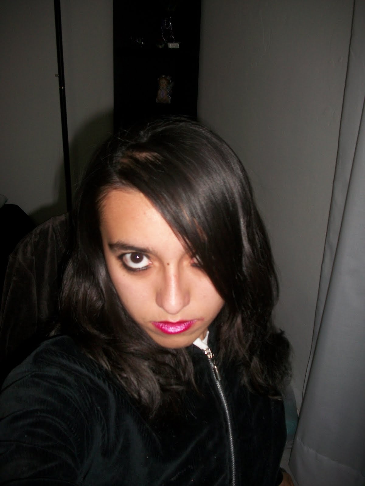 Pero en fin, la cosa es que, como les decía mi ocio ha llegado al etremo y eso es porque el otro día mientras platicaba con Yair, le dije: "voy a tomarme una foto de emo" (teniamos las camaras puestas y yo traía el cabello suelto), fui por mi cámara y empecé a posar, las poses iban bien, pero como estaba de blanco, Yair me dijo que con ese color no me la iban a creer... Así que me paré por una chamarra negra (el resto de mi ropa negra es muy fresa para ser de emo). Después vino la parte del maquillaje... y las mil tomas (bueno exagero...) con las poses emo que recordábamos en ese momento y el resultado fue el siguiente: